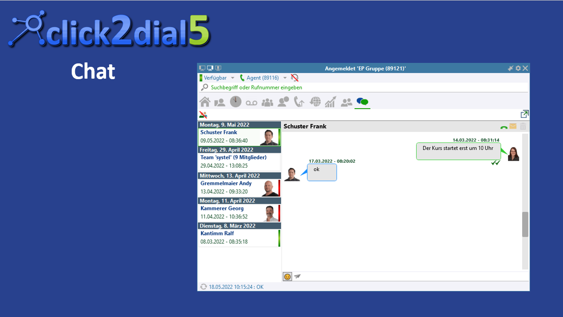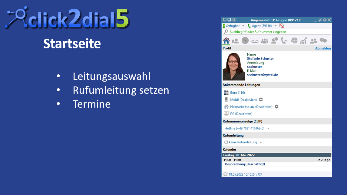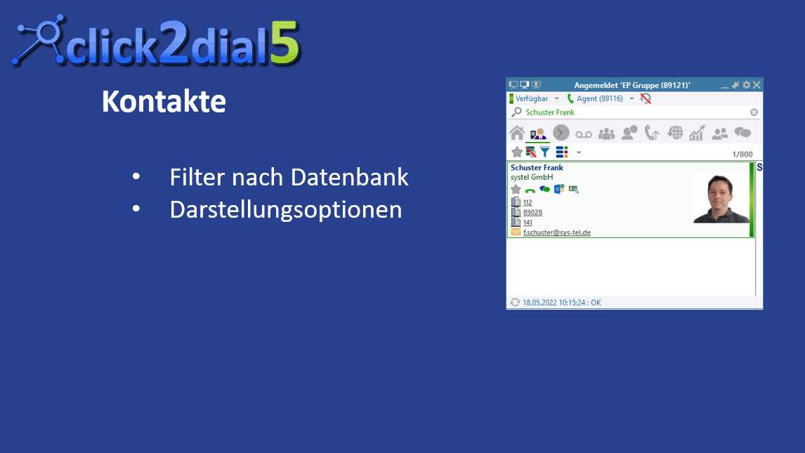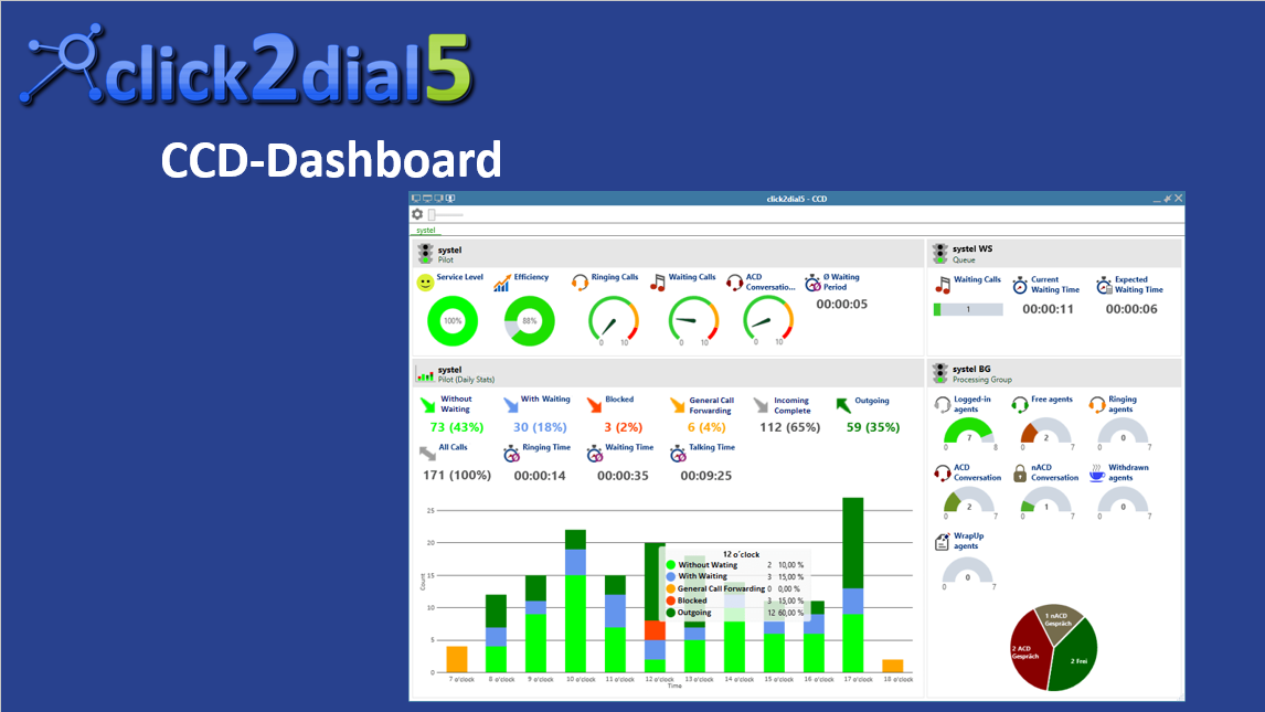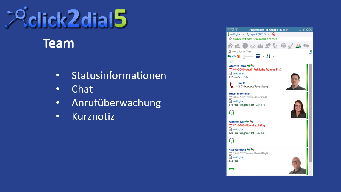 In der click2dial5 Teamansicht sehen Sie alle erforderlichen Präsenzinformationen wie Client, Telefon, Call Center Informationen (Angemeldet, Pause, Nachbearbeitung), Anwesenheit und Kalender Status. Das Fenster kann vom Client abgedockt und z.B. für die Zentrale auf einem zusätzlichen Monitor dargestellt werden. Weitere Funktionen wie Anrufen, Heranholen, Verbinden und Rufumleitungen setzen stehen auf Wunsch im Teamfenster für Ihre Teamkollegen zur Verfügung.