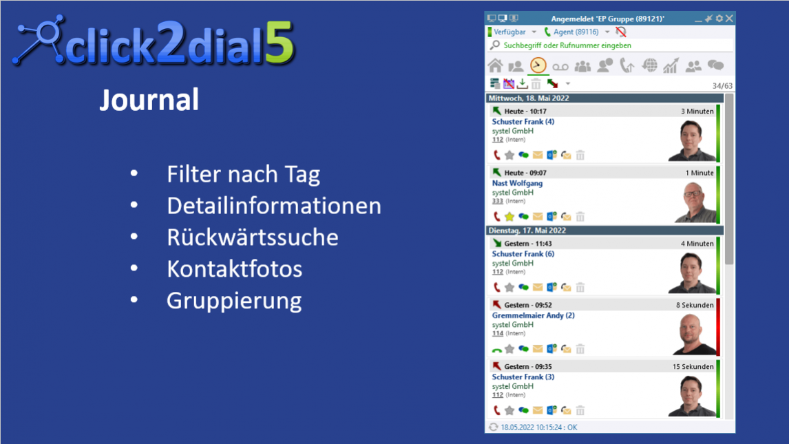 Im Journal werden bis zu einem Monat alle Anrufe (inkl. ankommend bei besetzt) aufgelistet. click2dial5 gleicht die Rufnummern mit Ihrer kompletten Kontaktdatenbank ab, damit Sie auch Informationen wie Name, Firma usw. zu diesem Anruf sehen. Können Anrufe nicht über ihre lokale Datenbank identifiziert werden, kann automatisch eine Anfrage über ‚DasTelefonbuch‘ erfolgen. Falls Sie nicht am Arbeitsplatz sind und einen oder mehrere Anrufe verpassen, zeigt click2dial5 optional eine Zusammenfassung der Anrufe in Abwesenheit an. Anrufe werden auch angezeigt, wenn Sie angerufen werden, und Sie gerade ein Gespräch führen!