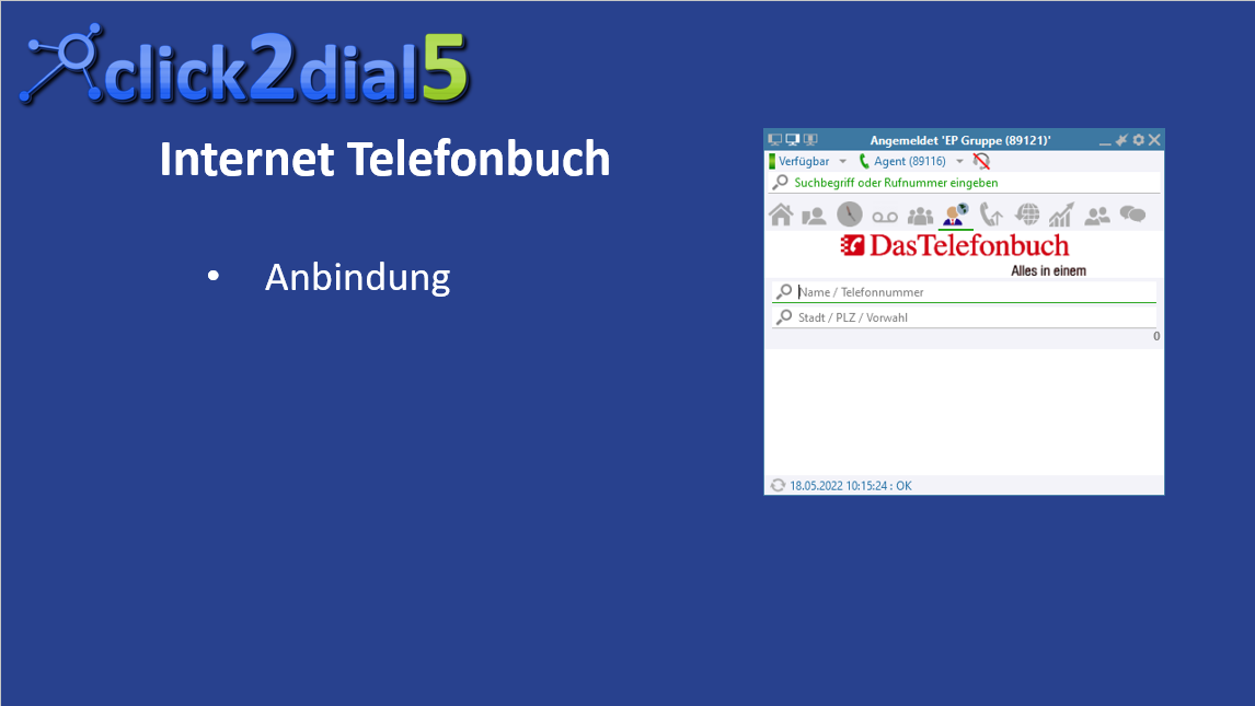 Mit der Anbindung des externen Telefonbuchs, können Sie direkt über das Internet Telefonnummern suchen. Diese Datenbank wird immer auf dem aktuellen Stand gehalten, somit steht Ihnen immer ein aktueller Datenstand zur Verfügung.