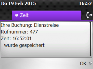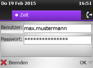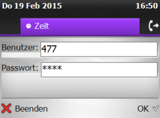 Die Applikation fügt sich als neuer Reiter leicht erreichbar in Ihr Telefon ein. Die Authentifizierung erfolgt über Ihr MS Active Directory mit Domänen Anmeldung oder mit Nebenstelle und Password, ganz wie Sie wünschen. Die Buchungsmöglichkeiten geben Sie unserer Applikation vor, wir schreiben eine Buchungsdatei, die Ihr vorhandenes Zeiterfassungs-System importieren kann.